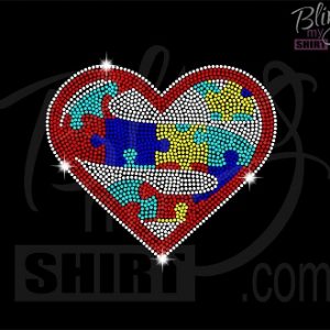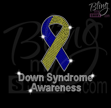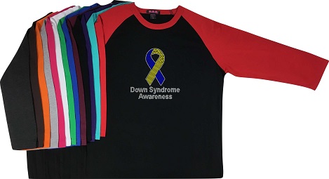 This great black raglan bling t-shirt boldly proclaims “Down Syndrome Awareness” in sparkly rhinestones. Featuring a blue and yellow ribbon design with multicolored rhinestones, this is the perfect shirt to raise awareness. Choose from a variety of sleeve colors to customize your perfect bling shirt!